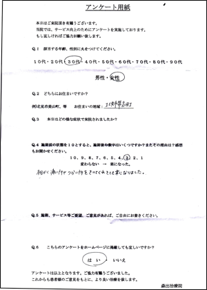 あくまで個人差がありますが、その場で実感いただけると思います。私としてはチャンスは1回きり、あっても2回だと思ってます。家で寝て回復を図るより影響が大きいと思います。